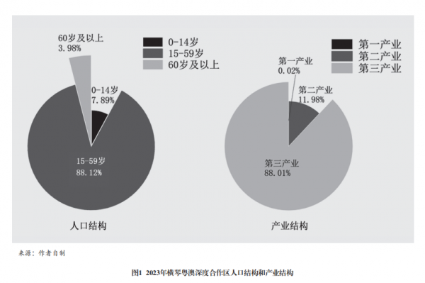 首先,橫琴粵澳深度合作區(qū)經(jīng)濟(jì)運(yùn)行總體態(tài)勢(shì)良好。人口結(jié)構(gòu)持續(xù)優(yōu)化,綜合實(shí)力快速提升。截至2024年9月,合作區(qū)常住人口約為4.8萬(wàn)人,年人口增長(zhǎng)率穩(wěn)定在8%左右。人才政策的精準(zhǔn)性使橫琴在吸引高端人才方面具有獨(dú)特優(yōu)勢(shì),使得橫琴人口結(jié)構(gòu)呈現(xiàn)出青年化、受教育程度高的顯著特征,主要表現(xiàn)為港澳高學(xué)歷人才集聚效應(yīng)明顯。第七次全國(guó)人口普查數(shù)據(jù)顯示,橫琴15~59歲的常住人口占總?cè)丝诘?8%,大學(xué)(大專(zhuān)及以上)常住人口占總?cè)丝诘?1%。澳資企業(yè)從業(yè)人數(shù)12837人,港澳居民在合作區(qū)跨境執(zhí)業(yè)專(zhuān)業(yè)人士數(shù)1400人。產(chǎn)業(yè)結(jié)構(gòu)契合發(fā)展定位,區(qū)位優(yōu)勢(shì)顯著。地區(qū)生產(chǎn)總值從2009年2.85億元增至2023年472億元。第一產(chǎn)業(yè)占比僅約0.02%,第二產(chǎn)業(yè)占比約12%,第三產(chǎn)業(yè)高度發(fā)達(dá)、占比約88%,是典型的現(xiàn)代服務(wù)業(yè)導(dǎo)向型產(chǎn)業(yè)結(jié)構(gòu)。橫琴的服務(wù)業(yè),特別是金融、旅游、文化創(chuàng)意、科技服務(wù)等行業(yè),占據(jù)了經(jīng)濟(jì)發(fā)展主導(dǎo)地位。這與橫琴作為自貿(mào)區(qū)、合作區(qū)的定位高度契合,政策支持、優(yōu)越的區(qū)位優(yōu)勢(shì)以及金融政策推動(dòng)了服務(wù)業(yè)的快速發(fā)展(見(jiàn)圖1)。
