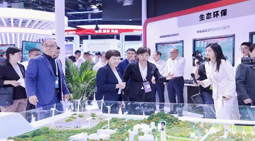 圖2? 北京市副市長(zhǎng)、民建市委主委司馬紅蒞臨國(guó)能龍?jiān)喘h(huán)保有限公司展區(qū)指導(dǎo)